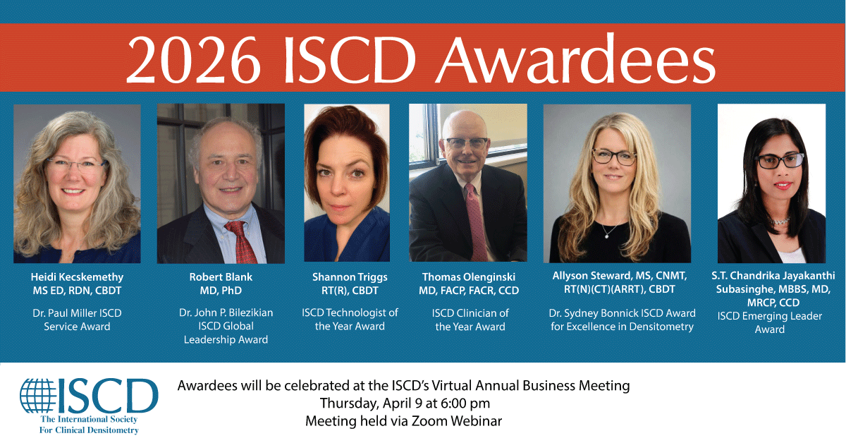 We are pleased to announce our 2026 ISCD Award Recipients and to recognize their contributions to the field of skeletal health assessment. These remarkable individuals were nominated by fellow ISCD members for their leadership, expertise and outstanding service to ISCD and our mission.