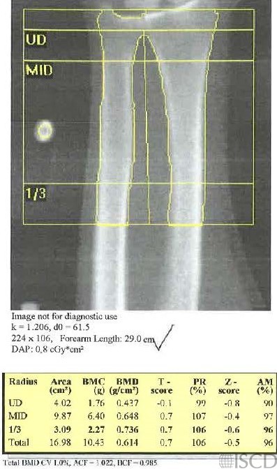 There is a button lateral to the ulnar styoid process. As part of the standard operating procedure for a DXA facility, external artifacts should be removed before scaning. In a Hologic scan, ths artifact would be removed from the soft tissue baseline. There is also motion artifact/tremor in the radius and ulnar (wavy lines).