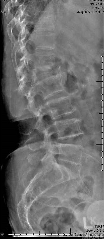 The follow-up DXA scan below shows a L1 fracture. This is accompanying lateral spine radiograph which shows the new L1 compression fracture on follow-up.