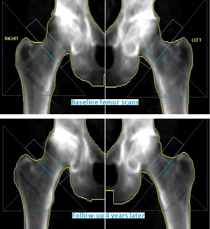 Between the baseline scan and follow-up, the right femoral neck BMD increased by more than 30% while the left neck remained stable. This same patient’s spine increased by 7% although it may have been somewhat falsely elevated due to sclerotic changes.