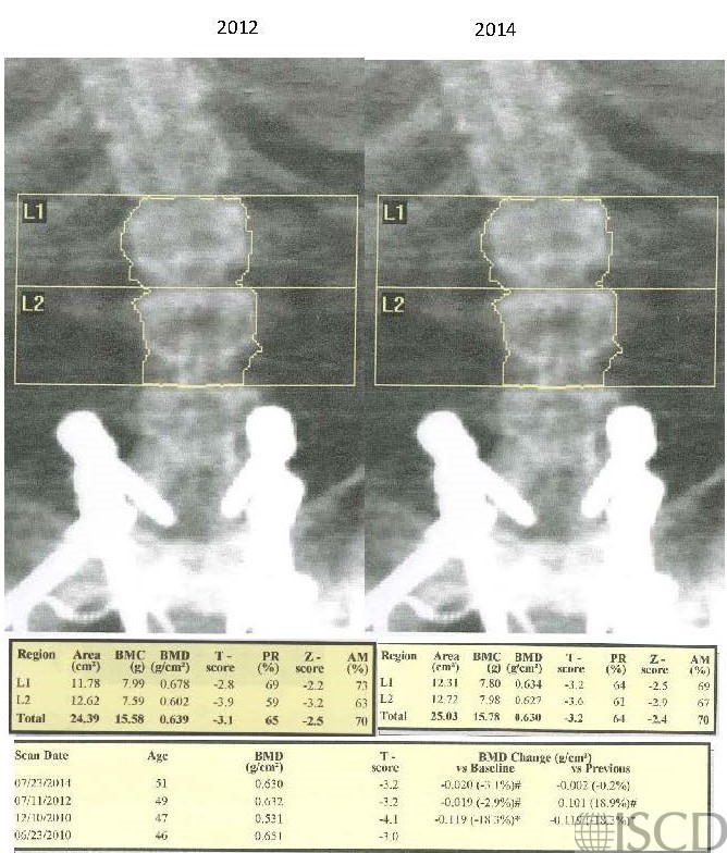 In this reanalysis of the scan, L3 and L4 are completely removed from the spine global region of interest scanned. Notice the difference in the interval change between 2012 and 2014.