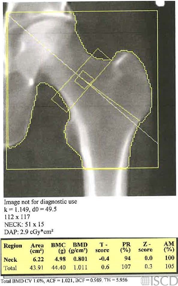 In this Hologic left hip scan,, the femoral neck is not anchored to the greater trochanter.