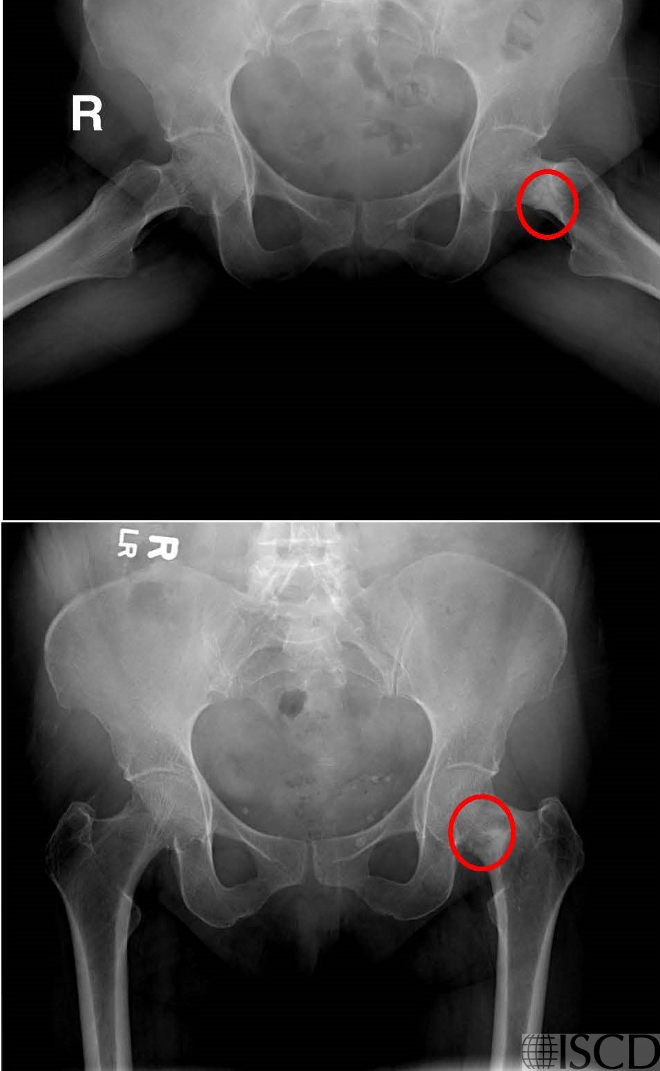 On the radiographs, a fracture in the femoral neck is aparent (red circles).