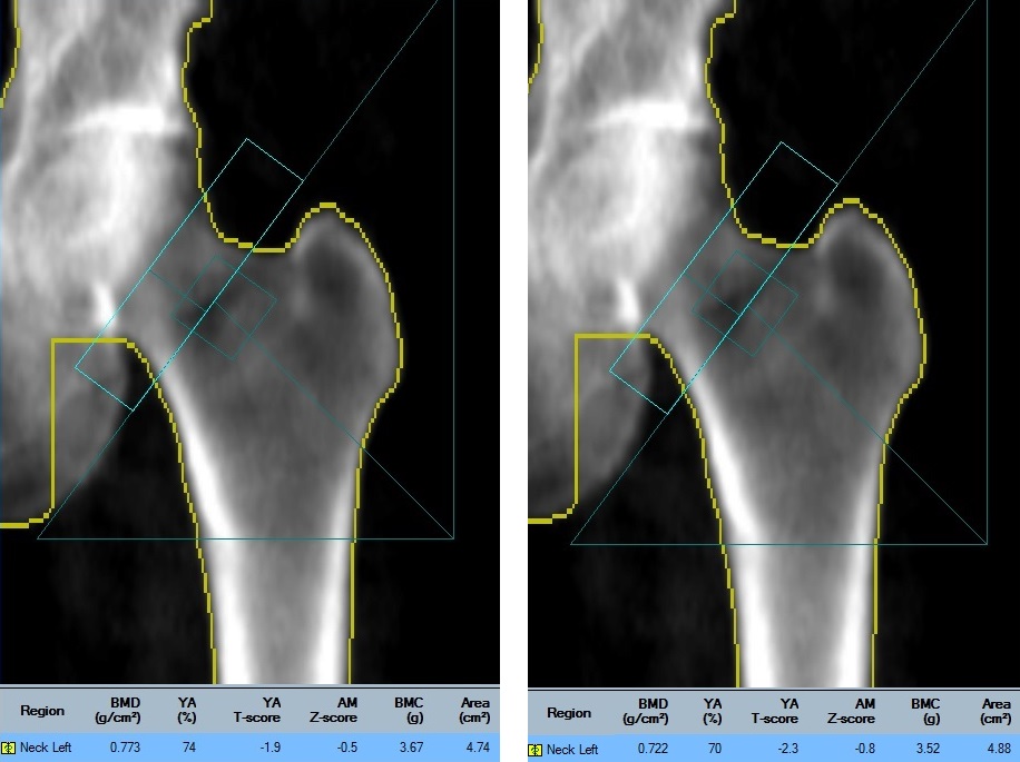 Two different placements of the neck rectangle for the same scan are shown here. When placed over the denser area of the pelvis, the ROI box calculates a falsely elevated the BMD. Excluding the pelvis from the analysis calculates the correct T-score of -2.3.