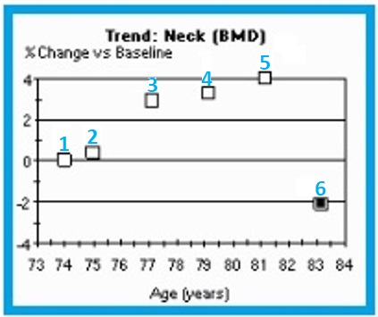 If the neck box includes the denser pelvis bone, the BMD will be falsely elevated. This is something that should be considered when interpreting serial scans. Out of the six numbered femur scans, the most reliable measurements are numbers 1, 2, and 6. When scan 6 is compared to scan 5, there appears to have been a BMD loss that exceeds the LSC for this facility, however this is likely incorrect. Scan 6 is more appropriately compared to numbers 1 and 2 from which there has been no significant change.