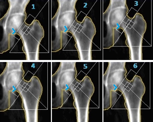 In femur scans 3, 4, and 5, the femoral neck rectangle overlies the brighter whiter bone of the pelvis, which is highlighted in blue here. In scans 1, 2, and 6, the neck box is positioned so that it excludes the denser bone that is not part of the femoral neck.