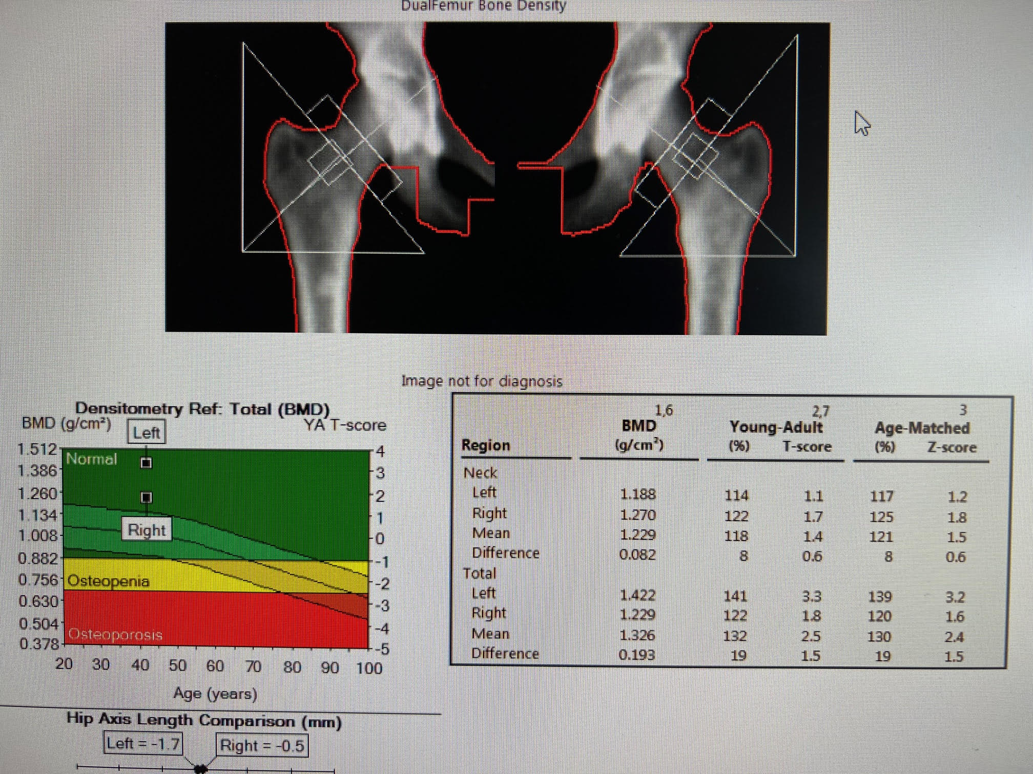 Increase in bone density at the left total hip with Z-score of 3.2