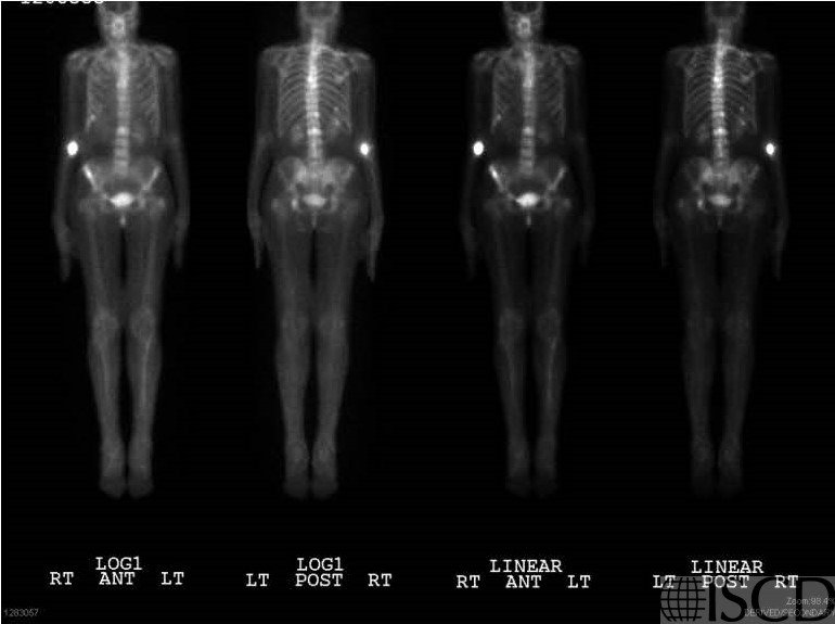 This is the nuclear medicine scan. The biopsy- proven diagnosis was metastatic breast cancer.