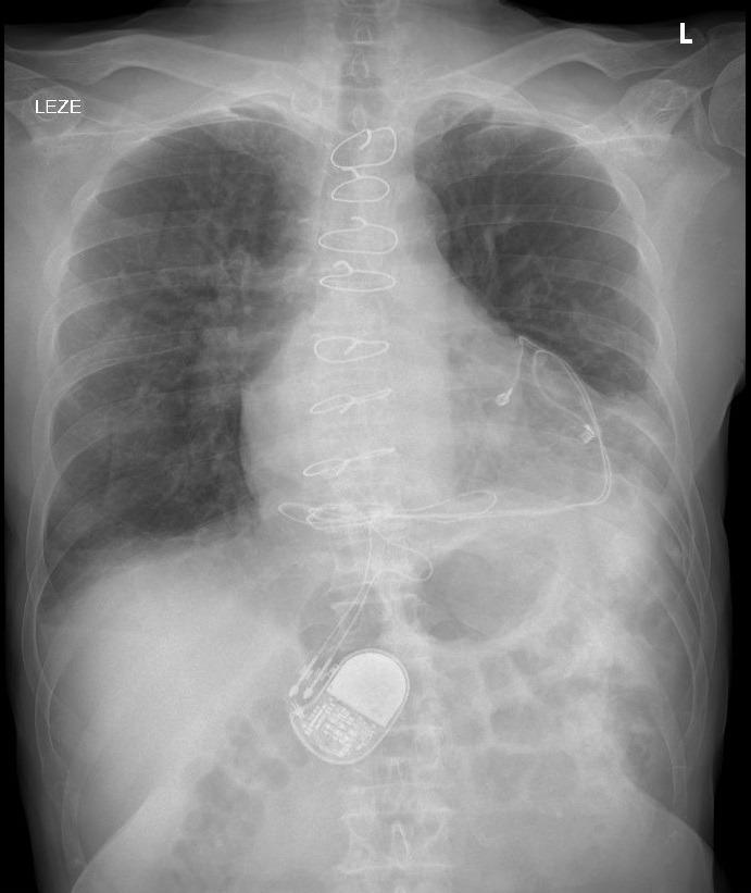 External or internal artifacts, such as bra wires, body jewelry, spinal fusion hardware, radiopaque medications are commonly encountered in DXA images. Because pacemakers are usually placed under collarbone, they are not seen on DXA image. However, in adults with heart surgery and children, often pacemakers with epicardial lead placement are used. Epicardial pacemakers are inserted in retrocostal, subxiphoid or subrectus location and can distort DXA measurements in this specific population.