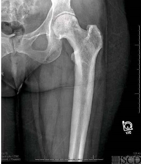 The corresponding radiograph in the left femur shows thickened trabeculations extending to the edge of the bone and thickened cortices extending to the middle of the shaft.