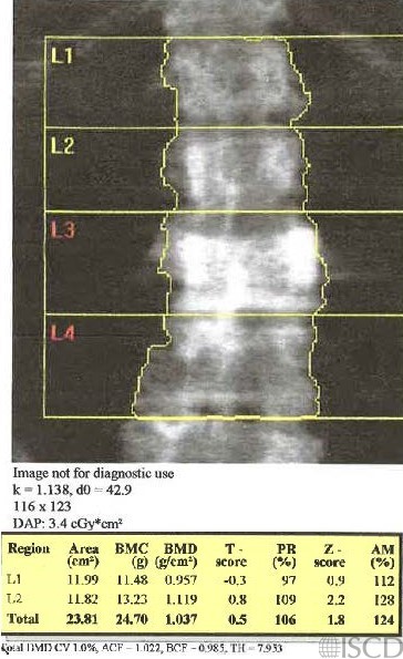 This is the lumbar spine scan of a patient with known Paget’s disease of the spine. There is diffuse sclerosis involving the anterior and posterior elements of L3 with a posterior wedge compression fracture felt to be from the Paget’s disease. It was noted that there are both sclerotic and lytic components in the L3 vertebral body. L3 and L4 are omitted from analysis.