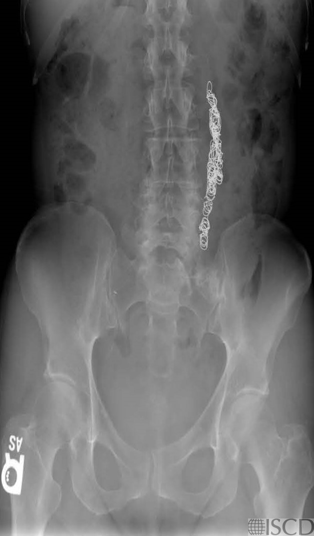 This is the accompanying abdominal radiograph showing the pelvic coils.