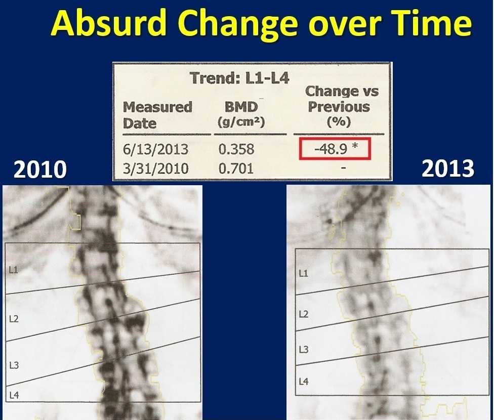 Images 2a and 2b show a different individual’s DXA scan. This case demonstrates the implausible magnitude of BMD change between serial scans.