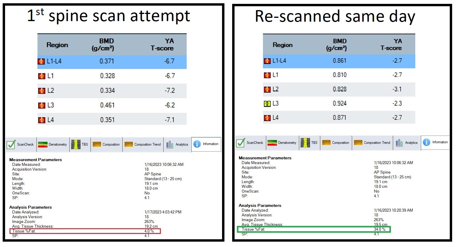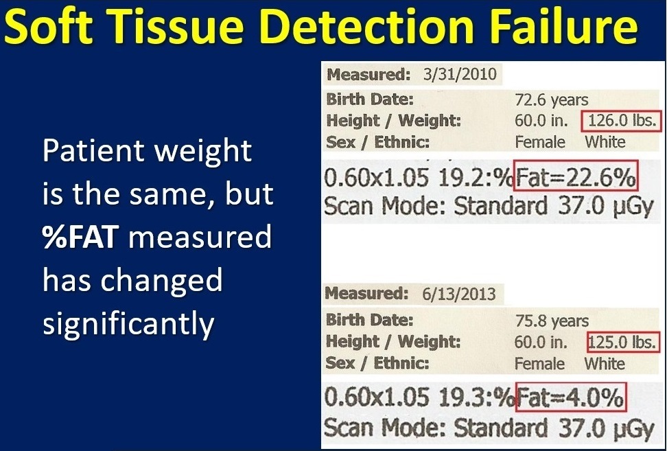 The patient’s weight on each date is nearly identical, but the %fat calculated is very different. Soft tissue detection failure can have an enormous impact on the apparent measurement.
