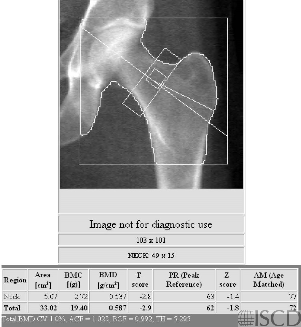 This is the left proximal femur Hologic DXA scan from a woman with biopsy-proven celiac disease.